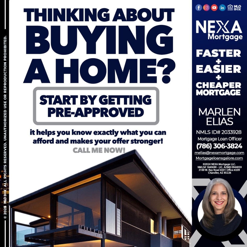THINKING ON BUYING A HOME? - Marlen Elias -Mortgage Loan OfficerHi, my name is Marlen Elias. I’m a Loan Officer with NEXA Mortgage LLC., offering personalized mortgage solutions, fast customized quotes, great rates and service with integrity.